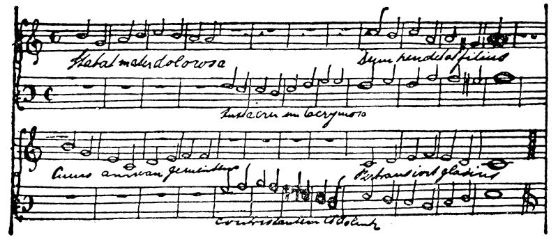 伴奏曲尚未写成,我以后可能还要做些改动。一看便知,除第四行以外,大部分都抄自赞美诗集。歌词是著名的拉丁文赞美诗:“Stabat mater dolorosa Juxta crucem lacrymosa Dum pendebat filius”