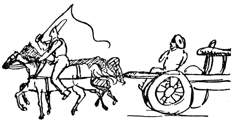 这里可以看到一个会战的场面,也就是街头即景,这是威悉河畔的一条沿岸大街,货物就卸在这里。拿鞭子的小伙子是马车夫,他马上要装运堆放在后面的一袋袋咖啡豆。右边扛袋子的小伙子是脚夫,正在搬运咖啡豆。脚夫旁边是酿酒师,刚刚取了样品,拿在手上;酿酒师旁边是船夫,咖啡豆就是从他船上卸下的。你无法否认,这些人都十分有趣。马车夫赶车时,他骑在一匹没有马鞍、马镫和马刺的马背上,一直把他双脚的后跟紧紧夹住马的肋骨,象这样: