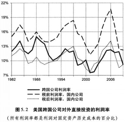 图5.2显示了这种利润率自1982年起的变动——那一年是可以获得这种数据的第一年,并且把它们和国内公司的税前与税后利润率的变动进行了比较。总体说来,所有这三组数据的变动是相似的。但是,当国内利润率自1982至2007年间基本上没有趋势时,对外投资利润率以每年0.13个百分点的趋势下降。在1982年低点到2001年低点期间,它也比国内利润率下跌的更加急剧。2001年税后国内利润率比1982年低3.1个百分点(下跌了28%),税前国内利润率低3.7个百分点(下跌了25%),而对外投资利润率则低4.4个百分点(下跌了37%)。