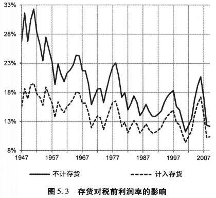 无论如何,在利润率的分母中计入存货,并不会对结果造成显著影响。图5.3清楚地表明,存货被计入后,税前利润率下跌的程度有所减少,但是,说利润率下跌到1982年并且此后没有出现持续性回升,这一点仍然是正确的。如表5.1所示,说财产收入利润率在战后第一个时期同样下降,并且在1982年以后继续下降,这一点也仍然是正确的。因此,美国公司利润率在1980年代早期以后没有出现一个持续性恢复,这个结论是可靠的;它并不取决于任何特殊的分子或分母的选择。