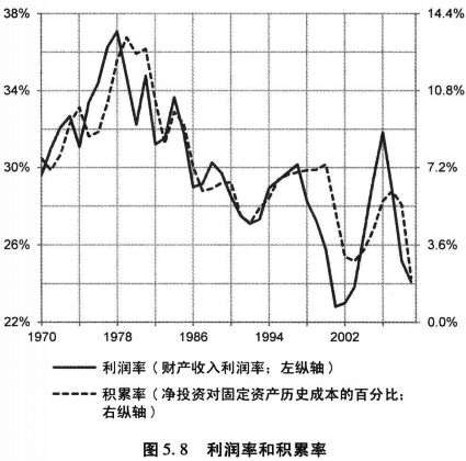 [14] 图5.8显示的利润率是财产收入对固定资产历史成本的百分比;积累率是以历史成本计价的固定资产净投资对固定资产历史成本的百分比。