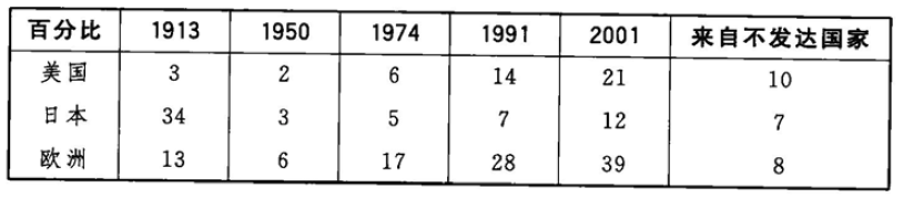 在“黄金时代”,进口竞争日益激烈是显而易见的,但是日本是个例外。1974年后,它一直稳定地占有欧洲2倍的进口市场份额,是美国的3倍多。这些竞争大多数来自于一些OECD成员国。虽然从南部进口产品发展也很迅速,占美国国内市场近1/10,但在其他发达国家却很少,因为中国占有主导地位。