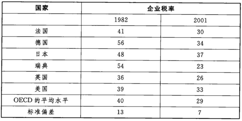 对于税收来说,由全球化带来的最显著的效果也许就是国家间的税收竞争,努力吸引国外的直接投资,并想方设法防止资金的外流。这必然迫使国家在压力之下削减企业税[1]。在OECD成员国,企业税率平均来看已有大幅下降,并且国家间的税率差距收敛显著(见表7.1)。然而,这对福利筹资的作用十分有限,企业税从未成为税收收入的主要来源,其中的原因在上面已经讨论过。20世纪60年代末期及20世纪70年代,企业税占总税收的比例处于下降趋势,反映出企业利润的缩水。到了20世纪80年代,在利润上升的支持下,这个比例趋于稳定。1980年和2000年,企业税在OECD成员国中占税收收入的比例相同(9%左右)。