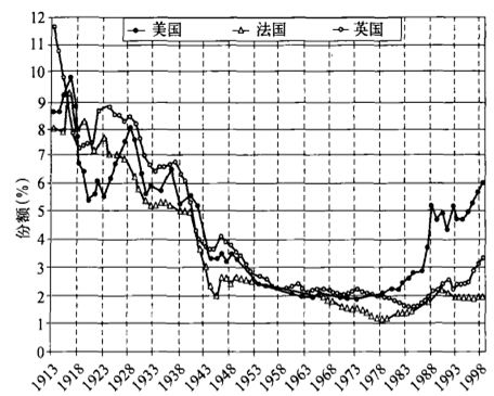 图1.3:阶级权力的恢复:美国、英国和法国收入最高的0.1%人口收入占国民收入份额,1913—1998
