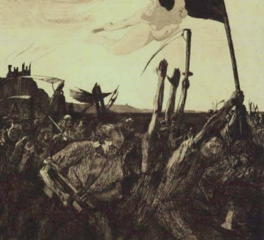 凯绥·珂勒惠支,《起义》(1899),线形蚀刻,铜版雕刻,飞尘腐蚀法,毛笔蚀刻,砂纸打磨,压花。(来自维基共享(wikimedia commons))