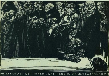 1919年,自由军团刺杀了斯巴达克联盟领导人卡尔·李卜克内西(Karl Liebknecht)和罗莎·卢森堡(Rosa Luxemburg)之后,珂勒惠支与数千名支持者一起参加了李卜克内西的葬礼,她开始同情德国共产党(Kommunistische Partei Deutschlands,或KPD)。为此,她雕刻了一张纪念李卜克内西的木版画,画中是一场基督教式的葬礼,李卜克内西平躺着,身着素服,周围是身着黑衣的哀悼者。他的侧脸似乎在发光,斑驳的光影映在一个男人的外套上,男人在抽泣,似乎没有意识至这些。