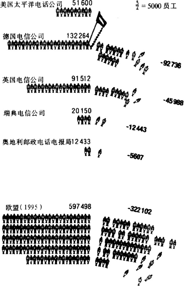 按美国太平洋电话公司1994年的工作效率(员工人均承接主机用户296户)计算,欧洲各电信公司多余的员工数字:资料来源:国际电信联盟:世界通信基本指迹;任狼星》杂志