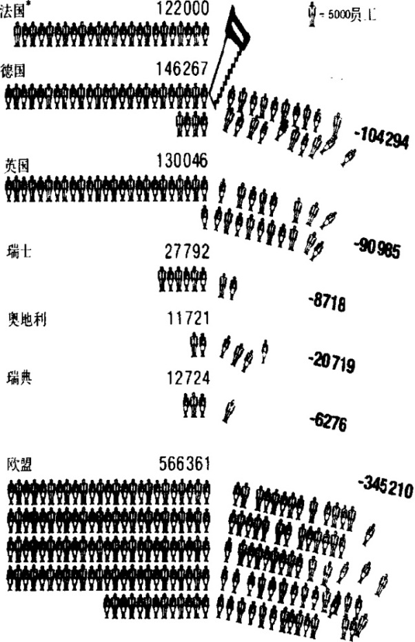 有些部门在不久以前对所使用的人员还允诺实行终身雇用制,并不在乎世界经济的景况如何。现在,这些部门也采用雇临时工的办法。如今不仅银行和保险公司有大规模裁减人员之势,而且远程通讯业、航空公司和公用事业部门也面临那样的前景。如果把各部门中有关时期的国际领先企业的效益当作标准,并以此为依据预测德国和欧洲其他一些国家的大公司未来裁员的前景,那么,整个欧洲就会显示出大批解职的趋势。有关这方面的预测情况,请看下面的示意图。德国和欧洲联盟在全球竞争中为饿狼提供了一块肥肉。